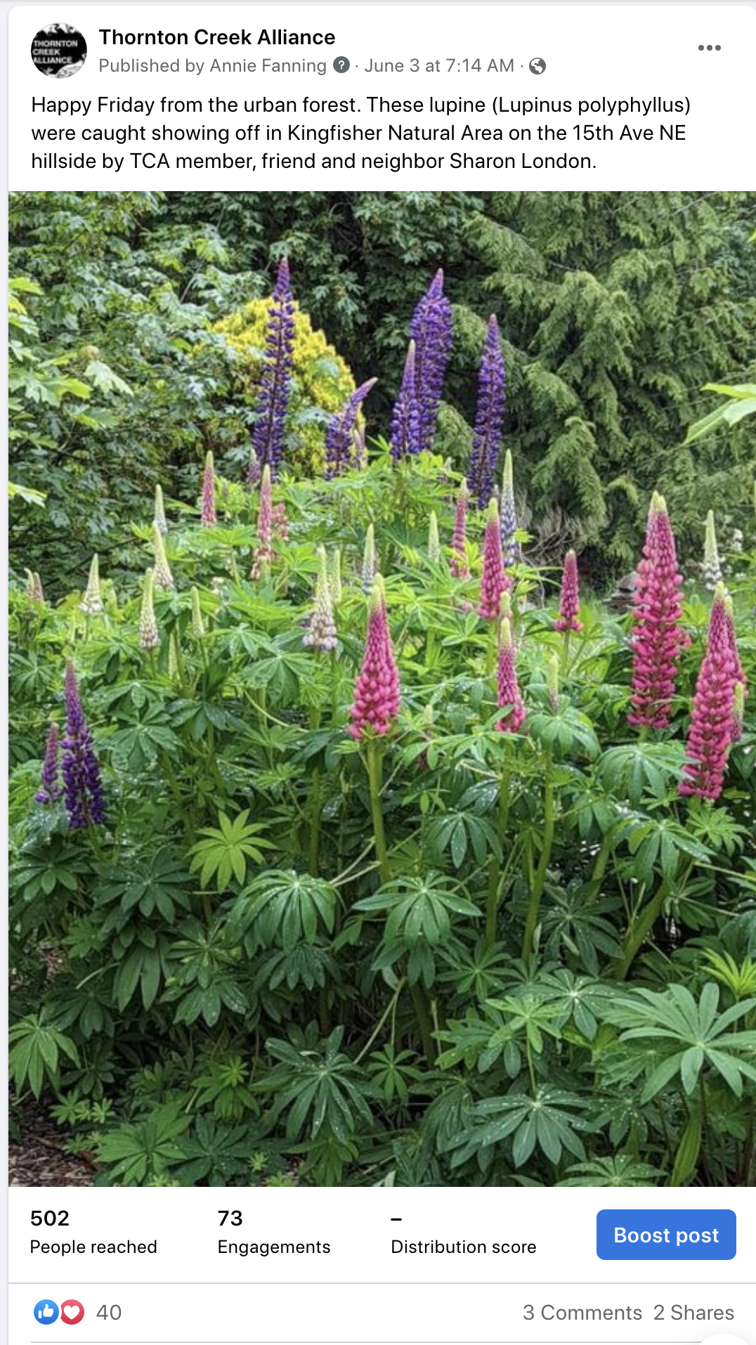 I have been on the board for the nonprofit Thornton Creek Alliance (TCA) for over a year, during which time I have contributed to its social media with original photography (that I have either taken or solicited) and short informative posts.